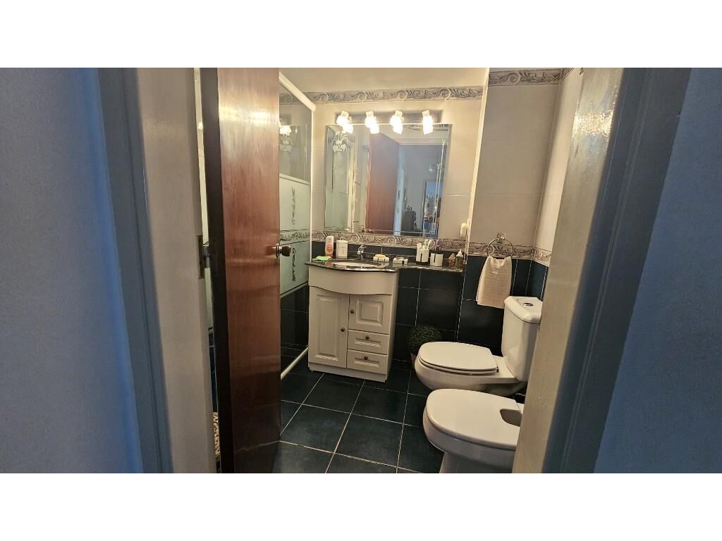 Baño completo con bacha y mueble y mampara de cristal. Tiene ventilación e iluminación natural.