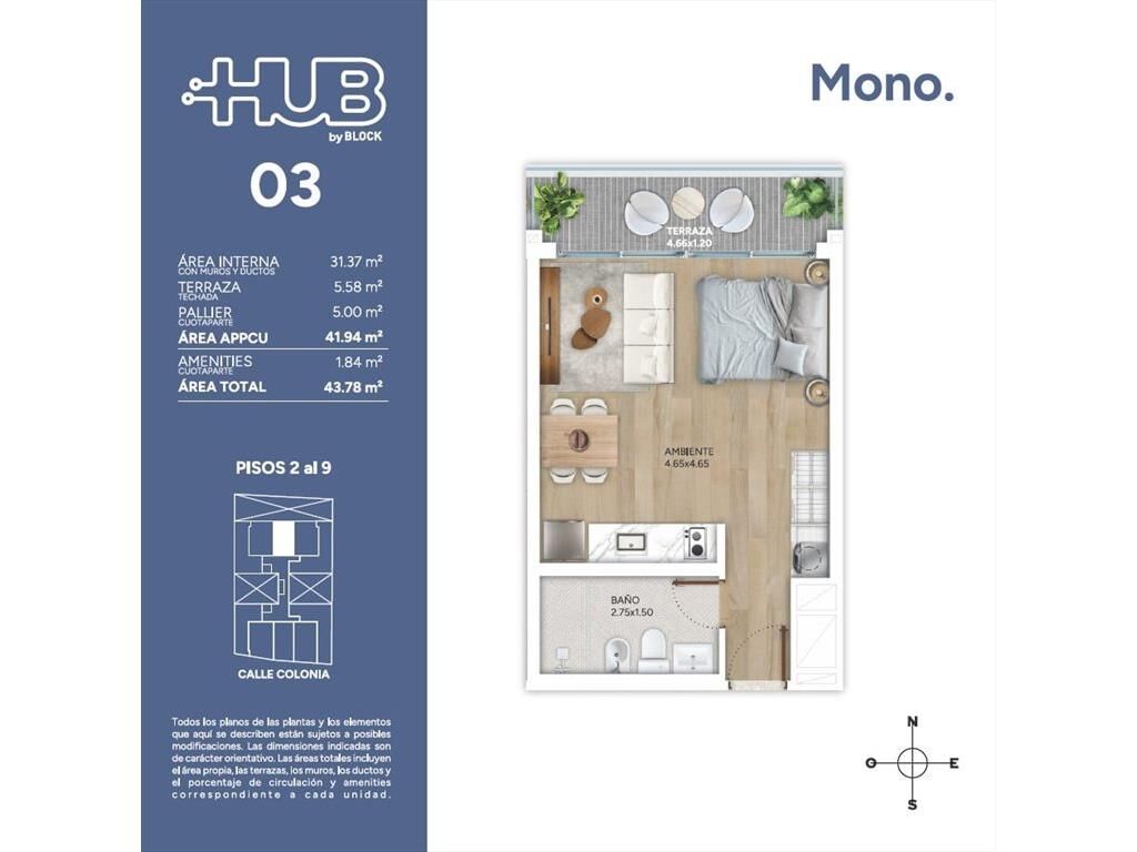 Venta de monoambiente en HUB by Block, ubicado en el barrio de Cordón - Colonia y M.C Martinez - a pasos de 18 de Julio y Tres Cruces.